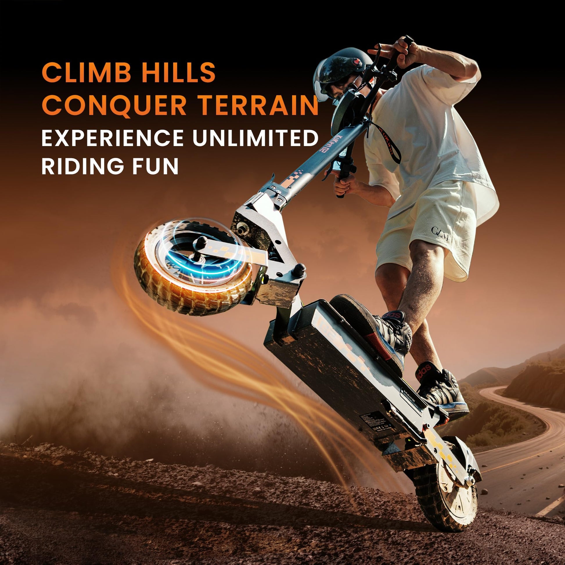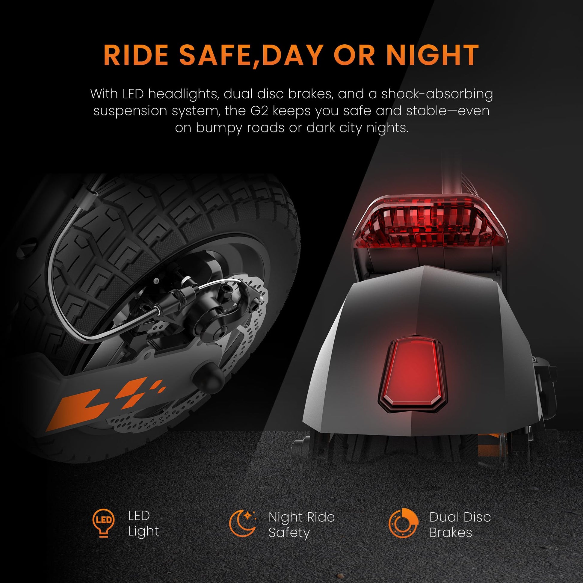 The KuKirin G2 is equipped with 10-inch off-road vacuum tires and front and rear spring shock absorbers, whose excellent grip and shock absorption ensure a smooth ride in all road conditions. The design of vacuum tires reduces the risk of punctures and increases safety and driving comfort. Whether you're riding on urban asphalt or gravel trails in the countryside, the KuKirin G2 can handle it with ease, providing an unparalleled driving experience.